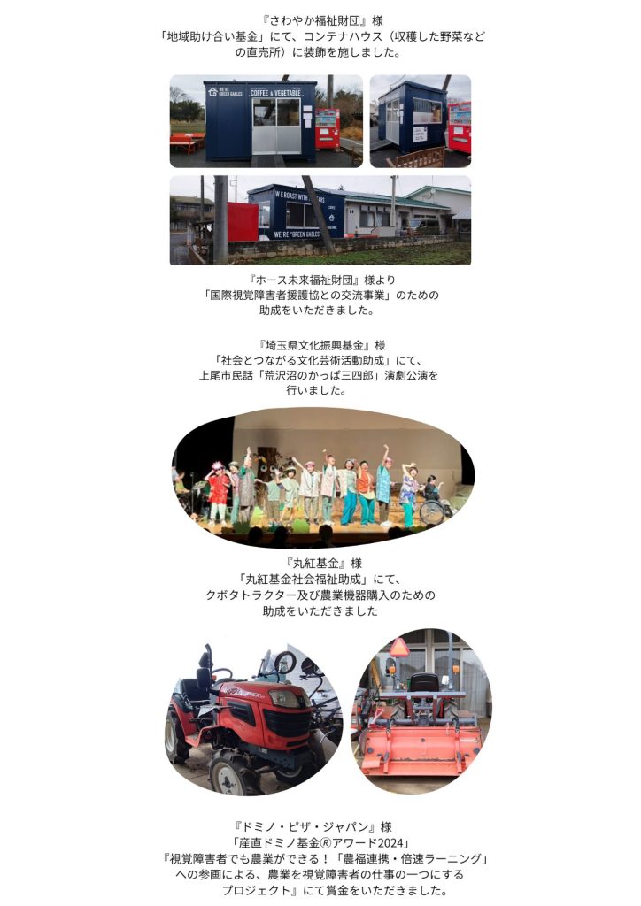 『埼玉県シラコバト長寿社会福祉基金』様より、「ヨガワークショップ、スマホ・タブレット研修、コーヒー焙煎、タンデム自転車、表現・演劇ワークショップ、ピアサポーター育成、他団体見学等」に対し助成をいただきました。